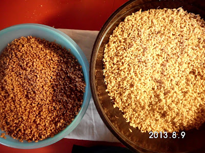 After they are sprouted you can use them now or dehydrate them. To dehydrate the wheat I spread them out on a cookie sheet and let air dry. Every now and then I would go back and move them around to make sure everything was getting air. (Note: This will work better in a dry climate. If the humidity is too high it may cause the wheat to mold.)
